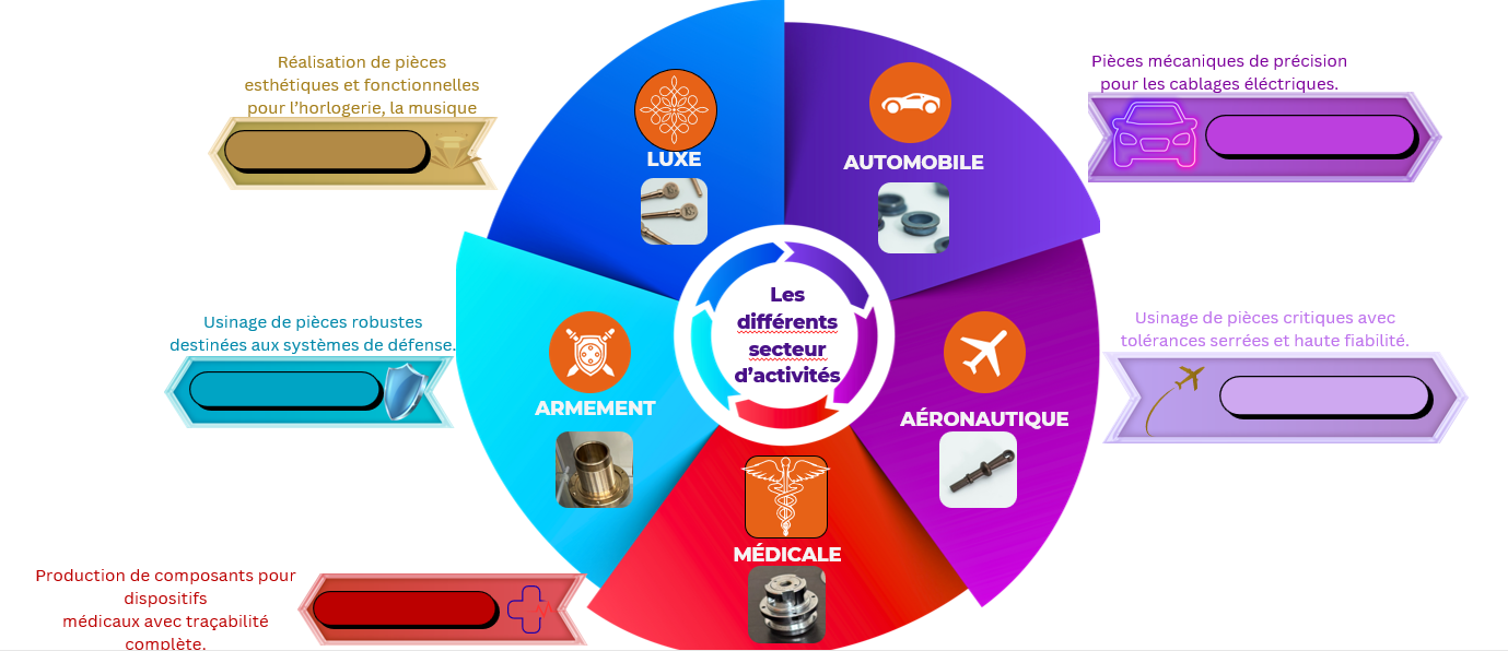 Nous produisons nos pièces décolletées dans le but d'approvisionner les secteurs automobile et aéronautique, mais également de l'armement et du nucléaire, du luxe, ferroviaire et de levage de charges.